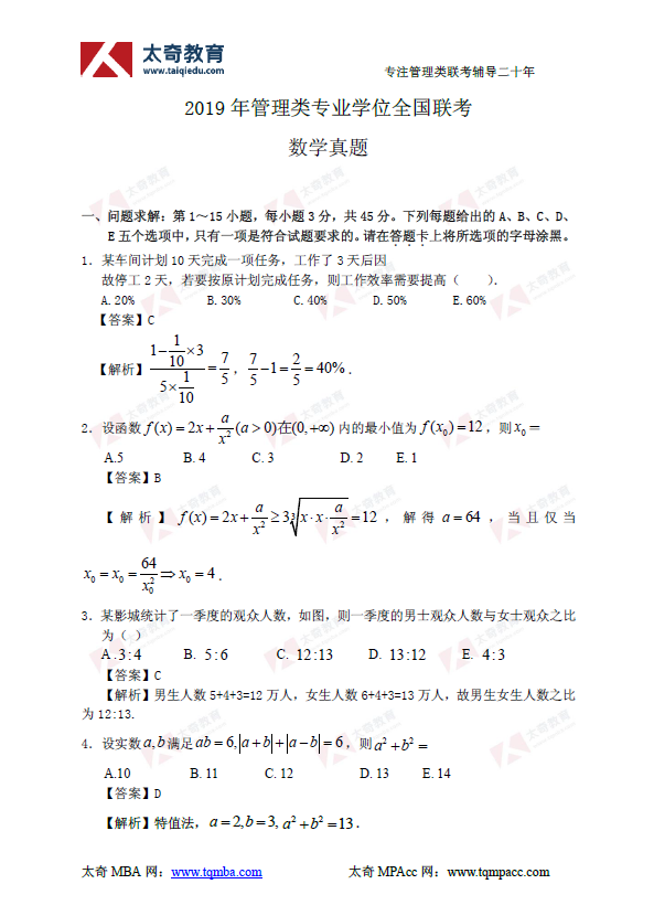 2019年MBA/MPAcc管理類聯(lián)考數(shù)學(xué)真題及答案