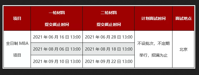 2022年全日制MBA項(xiàng)目的一輪材料提交最終截止時(shí)間為2021年09月10日13:00,二輪材料提交最終截止時(shí)間為2021年09月22日13:00,申請(qǐng)人必須在此之前在線填寫材料,檢查無(wú)誤后直接在線提交。