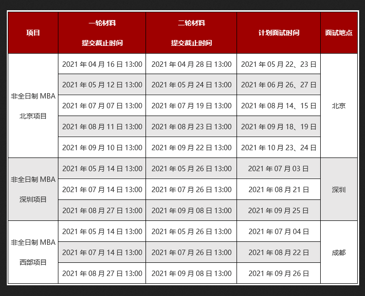 3. 全日制MBA項(xiàng)目、非全日制MBA北京項(xiàng)目、非全日制MBA深圳項(xiàng)目、非全日制MBA西部項(xiàng)目(上課地點(diǎn):成都)分別獨(dú)立招生,一旦給予預(yù)錄取資格或有條件預(yù)錄取資格,不能做任何項(xiàng)目調(diào)整。