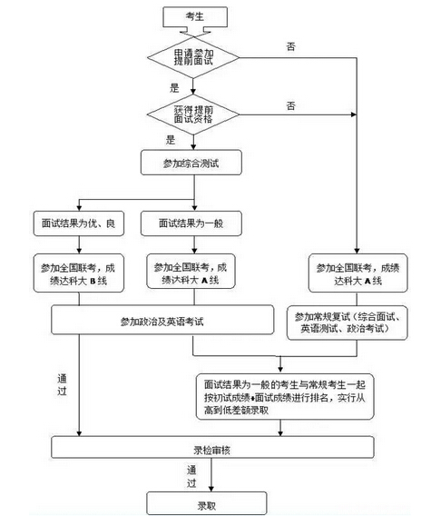 1.“提前面試”招生方式。采取“提前面試申請、背景評估、提前面試(綜合素質(zhì))、網(wǎng)上報名、現(xiàn)場確認、全國聯(lián)考、復試(政治理論考試和英語面試)、正式錄取”的方式進行。凡符合教育部規(guī)定的MBA報考條件的考生均可申請?zhí)崆芭嬖嚕嬖嚱Y果達到要求的考生享受相應的專項政策。